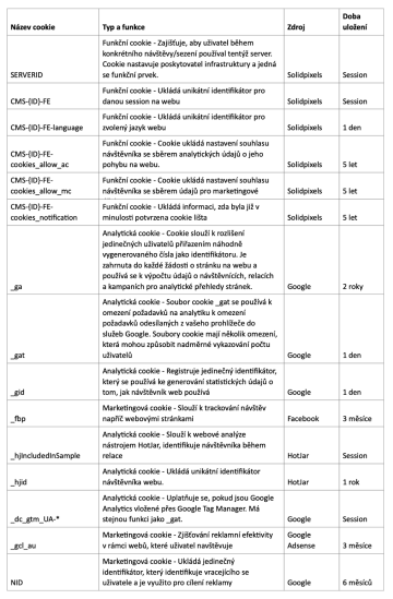 Konkrétní cookies a bližší informace přímo o nich najdete v tabulce v závěru tohoto dokumentu.
